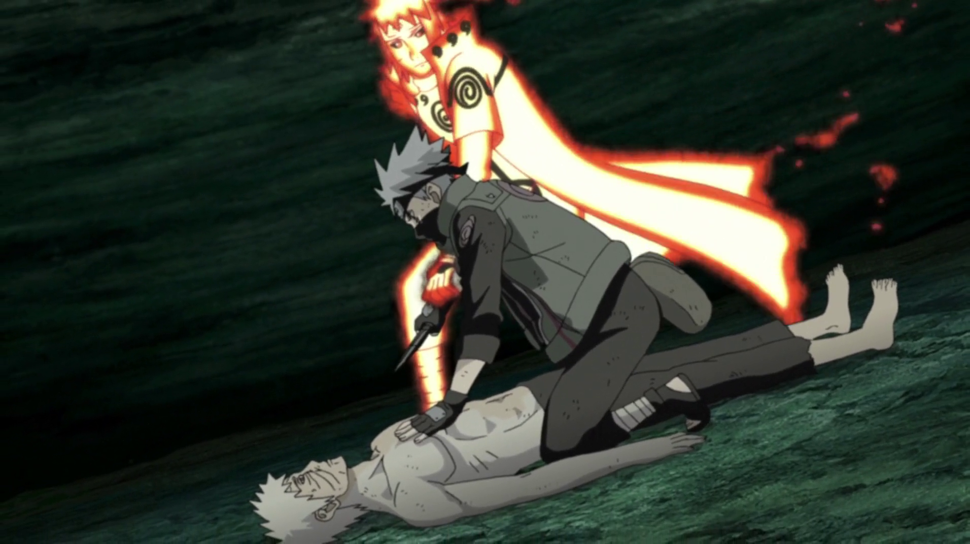 Minato stops Kakashi from killing Obito.