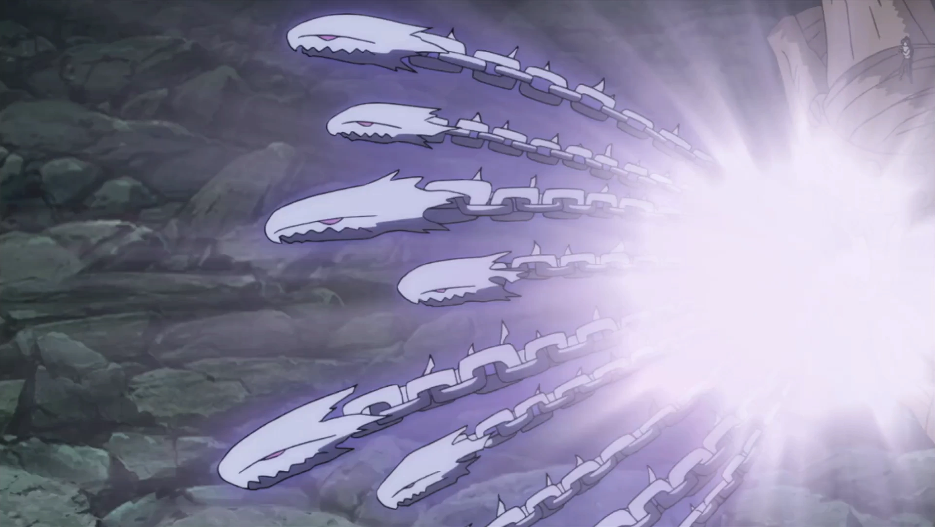 Through the Outer Path, the user is able to manifest chakra chains, which bind anyone they touch. According to Obito, this binding power is far greater than that of Nagato's Outer Path.[3] The chains possess a cursed seal that suppresses the power of tailed beasts,[4] and also cause a great deal of pain to their victims.[5]