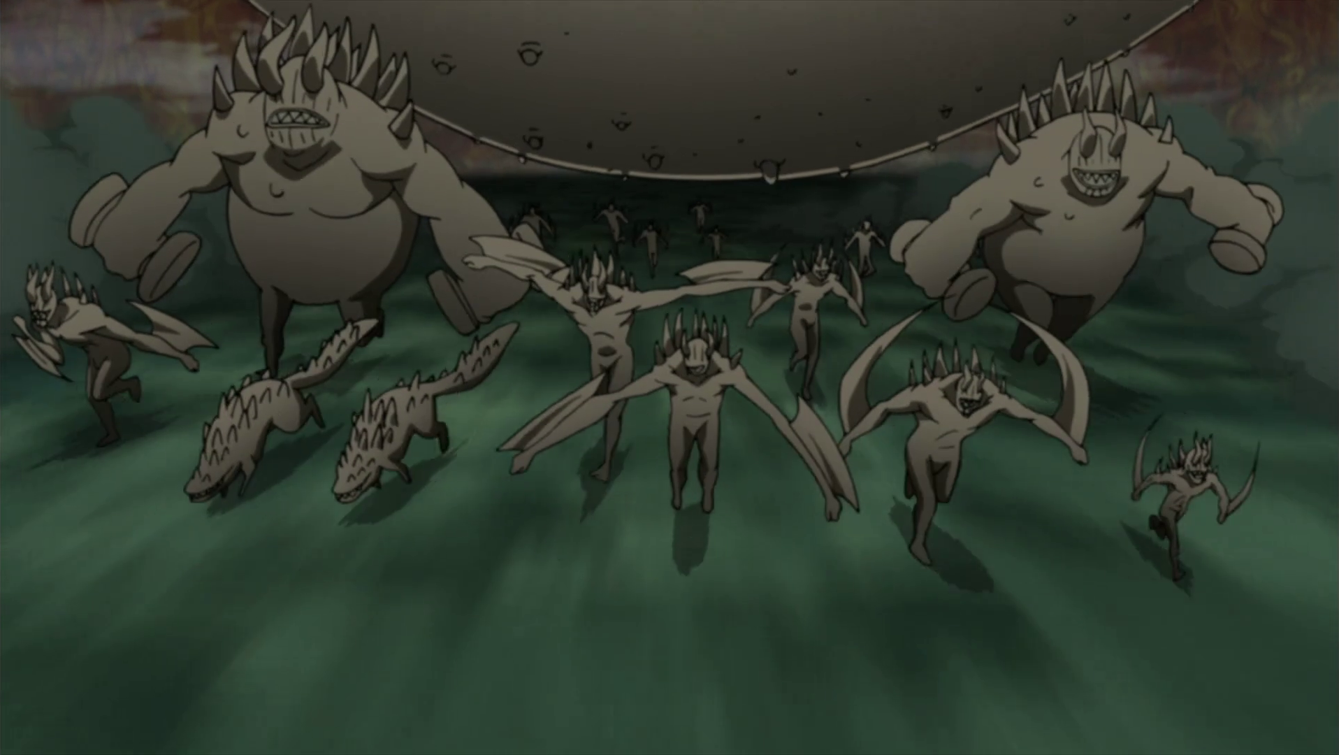 Among those produced by the Ten-Tails fought during the Fourth Shinobi World War, most were roughly the size and shape of an adult male human, with extremely long arms that had axe- or sickle-shaped blades protruding from their forearms. Others were about half that size and stocky, with spear-like appendages in place of forearms. Larger variants produced by this specimen ranged from about three times the height of an adult human up to the height of summoned creature, with a brutish physique with rotund stomachs. Many held yawara in each hand, while others carried spears or had sickles in place of forearms, and some even created spiked-shields. It also created a number of fission beings that superficially resembled wolves, being quadrupedal with tails, large angular heads, and mouths so wide that they extend nearly to the shoulder. In general these fission beings had two horns curving back from their foreheads, rictus mouths filled with sharp teeth, and spines covering their chest, shoulders, and backs.