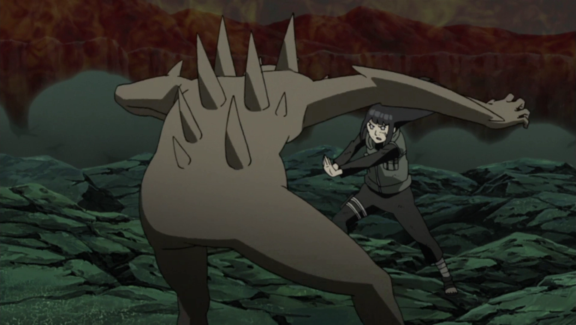 Hinata repelling a Ten-Tails mini-clone with the Eight Trigrams Sixty-Four Palms.
