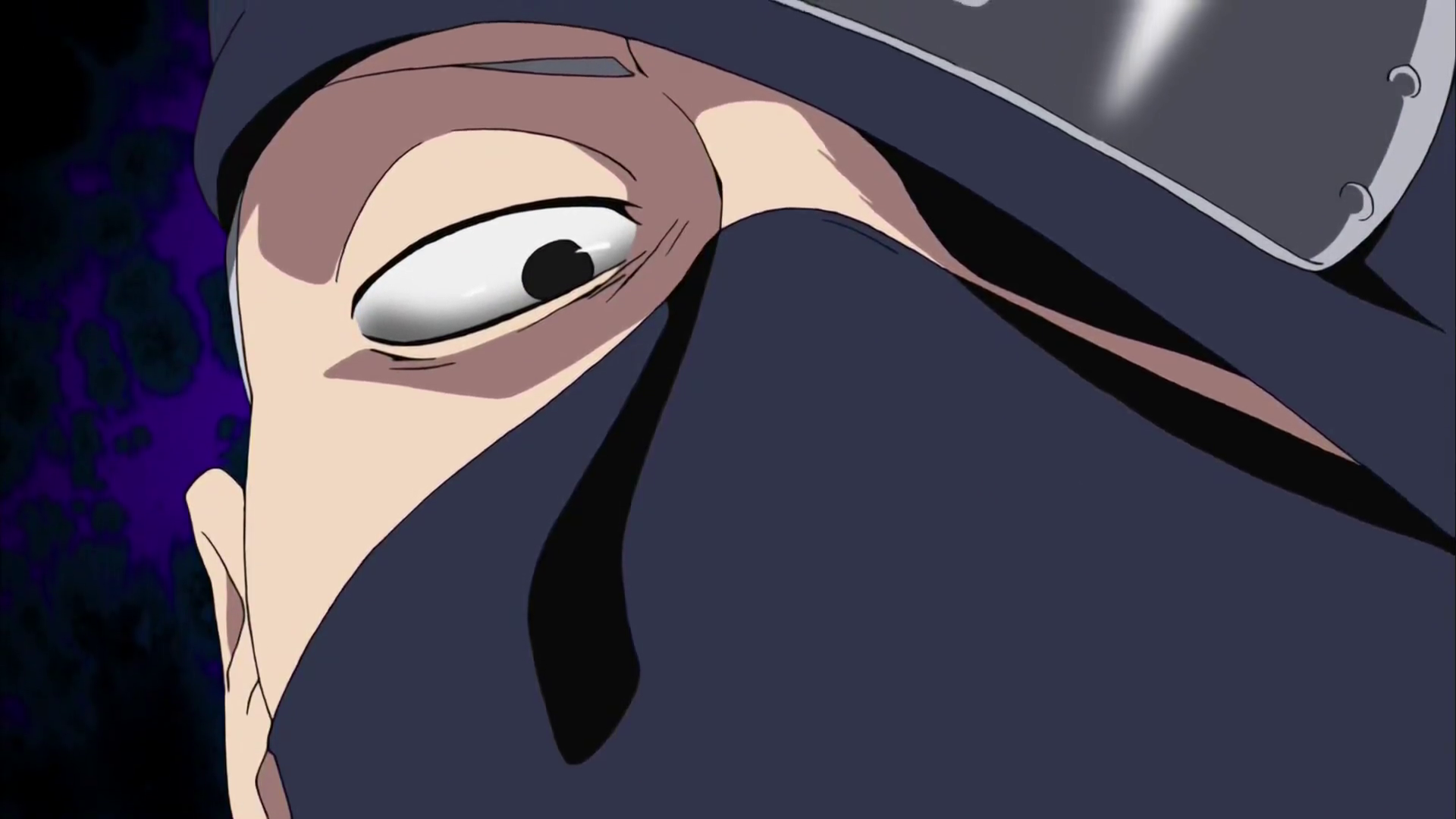 Kakashi has a strong resemblance to his father, so much so that they are sometimes mistaken for each other. [37] He has spiky silver hair often oriented to his left-side, dark grey eyes (black in several instances), and typically a relaxed and lazy expression. During the Third Shinobi World War, his left eye was damaged, leaving a vertical scar from the injury. The eye was shortly afterwards replaced with a Sharingan, which he covers with his forehead protector when he isn't using it. After his original eye was restored by Naruto during the Fourth Shinobi World War, Kakashi returned to wearing his forehead protector balanced above his forehead. Since early childhood and near-constantly, he wears a mask that prevents most of his face from being visible. Even his ninken have seen his face so sparingly that most of them don't remember what he looks like unmasked.[38] On the few occasions he exposes his full face, he has a narrow jaw-line and a beauty mark under the left corner of his mouth.[39] Overall, he is considered very handsome as seen from Teuchi and Ayame's reaction to seeing his face.[40]