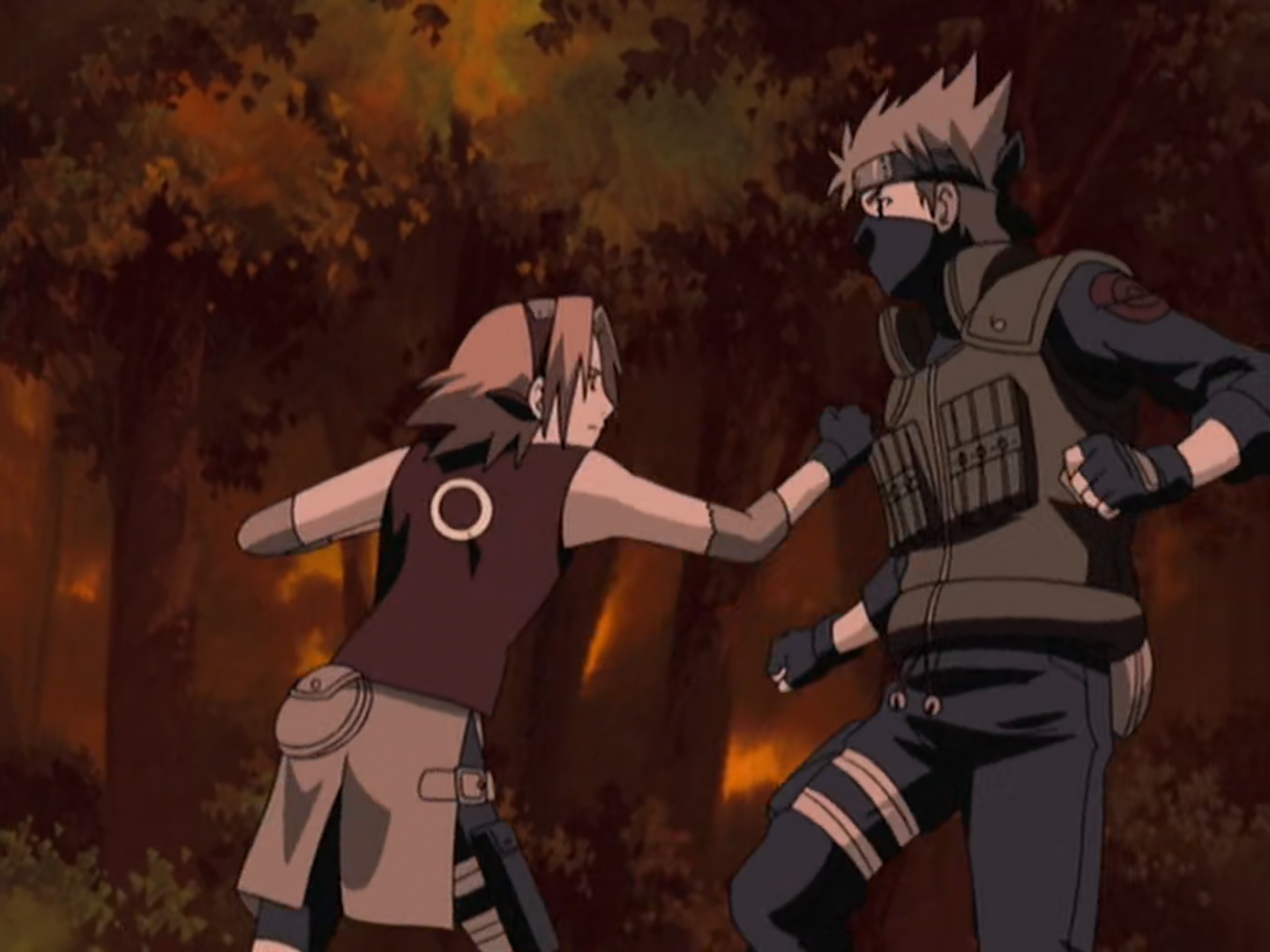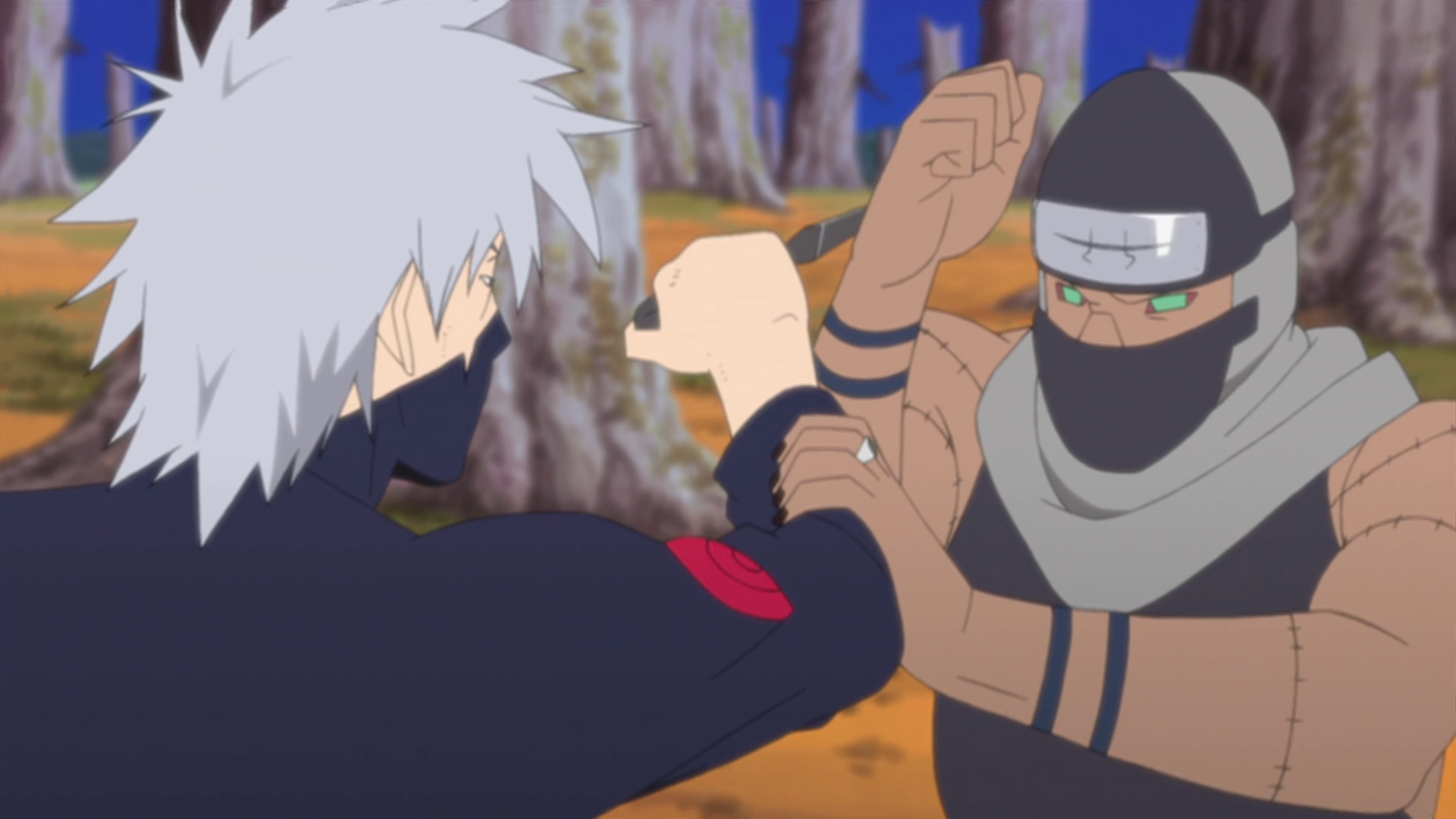 Kakashi engages Kakuzu in hand-to-hand combat.