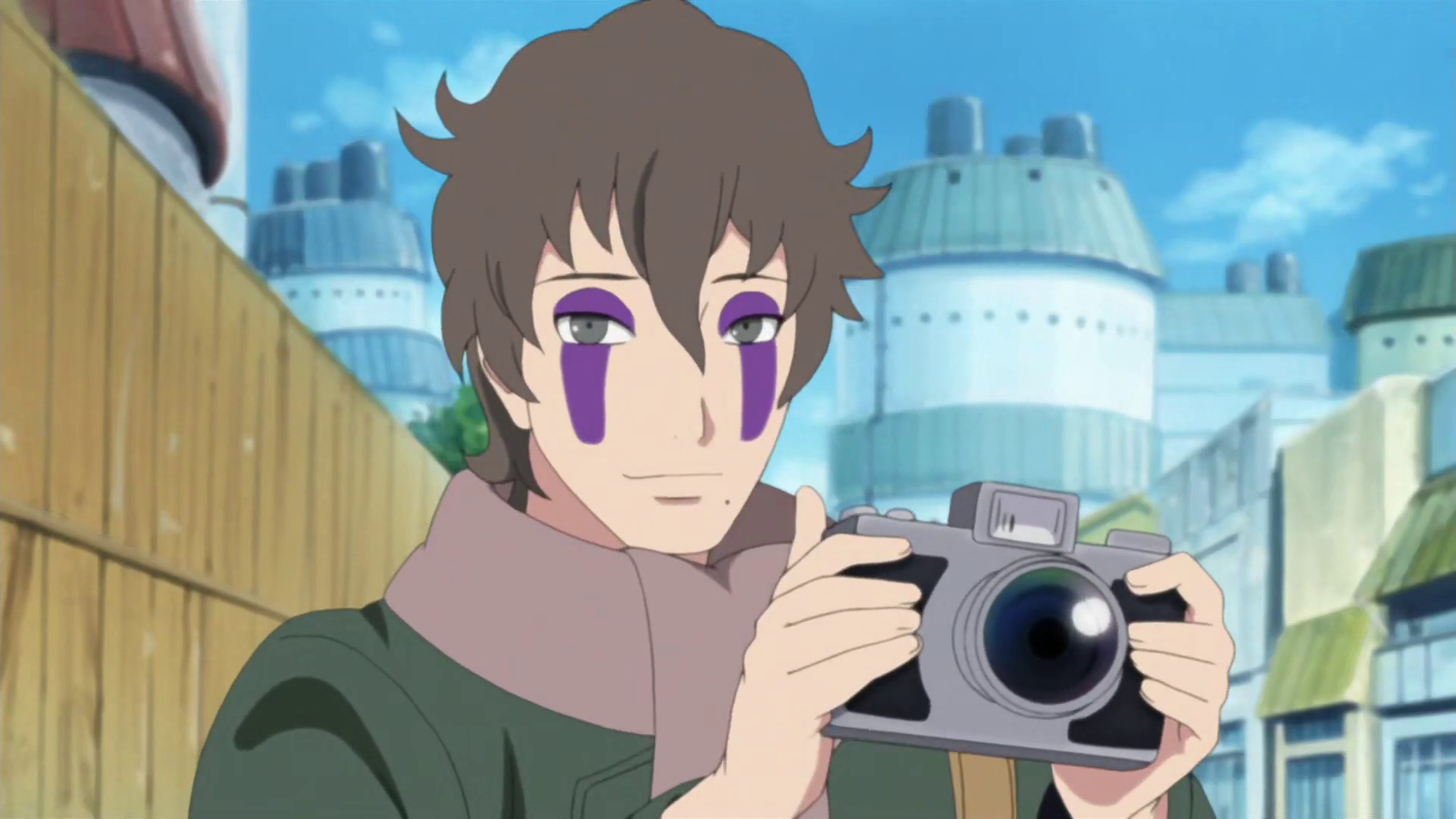 Kakashi wore several different outfits prior to Part I. In the academy, he wore a long sleeved anchor-grey shirt with a zipper, a green scarf and slate-coloured shorts. He also wore blue sandals, which he also wore during the Third Shinobi World War. During the Third Shinobi World War, he wore a black T-shirt with white stripes in the middle of the sleeves, additional sleeves over his arms, metal arm protectors, leather straps around his back and chest, and dark pants. Prior to its destruction, his family's White Light Chakra Sabre was kept in a small holder in the middle of his back. During his Anbu career, he wore a simple blue suit with a grey flak jacket, strapped up sandals and arm guards that went up to his elbows. While not on duty as an Anbu, he wore a similar outfit with segmented gauntlets and bandages over his calves. His fox mask[42] had red and black markings around the eyes, sides, and mouth. One trait left over from his career as an Anbu is their signature tattoo resembling a red flame on his left deltoid.