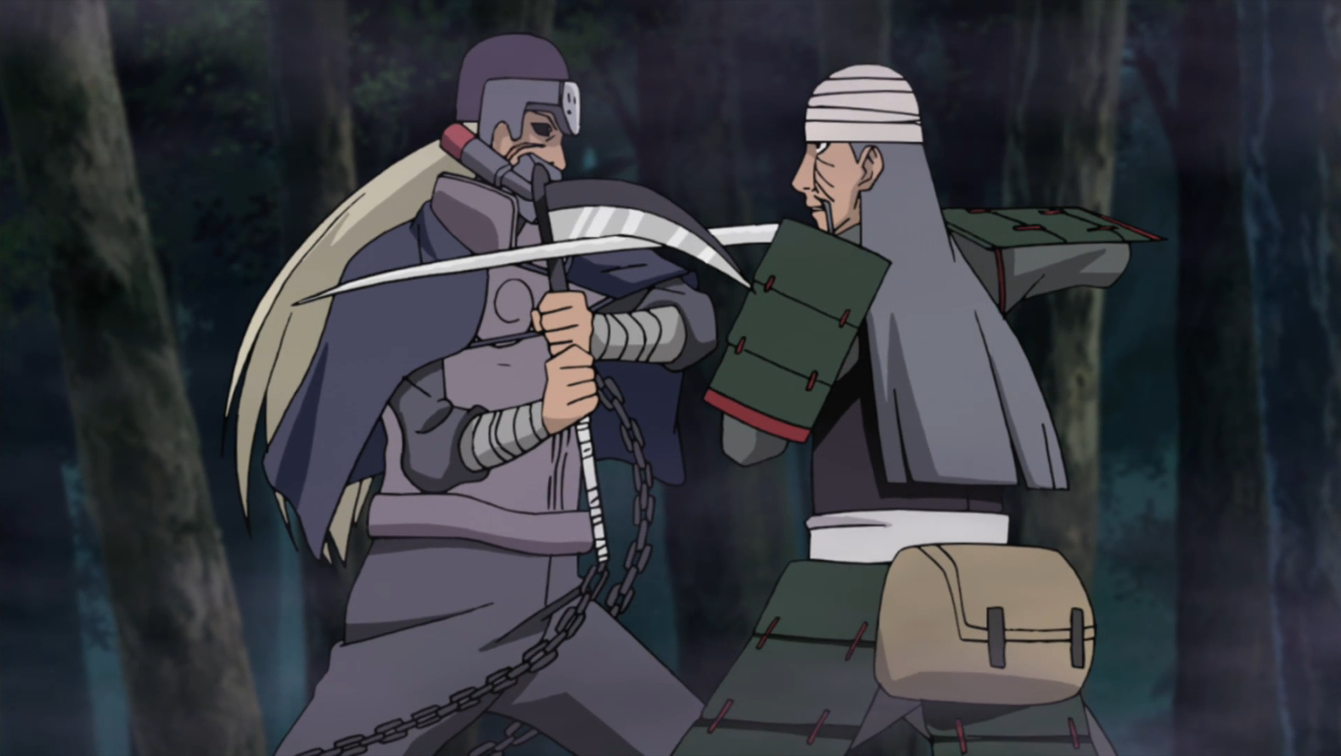 As the Surprise Attack Division attempt to retreat to the rendezvous point, they are chased by reinforcements of the Akatsuki's own Surprise Attack and Diversion Platoon. Amongst their members are Hanzō of the Salamander who summons his salamander and orders it to attack. The salamander then unleashes a cloud of poison from its mouth that renders the division paralysed. However, Mifune and his division soon arrives and deflects the would-be devastating blow. Conversing about the past and the paths they had chosen to walk, as the two traded blows, Hanzō commands his salamander to come from underground where he had told it to hide. Swallowing Mifune whole, the shinobi prematurely claims victory before the head of his summon is cleaved open and Mifune re-emerges. Moving in for a final blow, Mifune is able to break Hanzō's sickle and respirator. Finally remembering his encounter with Mifune in life, Hanzō moves towards his broken kusarigama and using the blade commits seppuku telling Mifune that he entrusts him with his conviction. This act cuts the poisonous sac that had been placed in Hanzō's body when he was a child, and causes the poison to leak out and evaporate. Shocking Kabuto Yakushi, Hanzō's body ceases to respond to his orders and the legendary shinobi is soon bound and sealed.