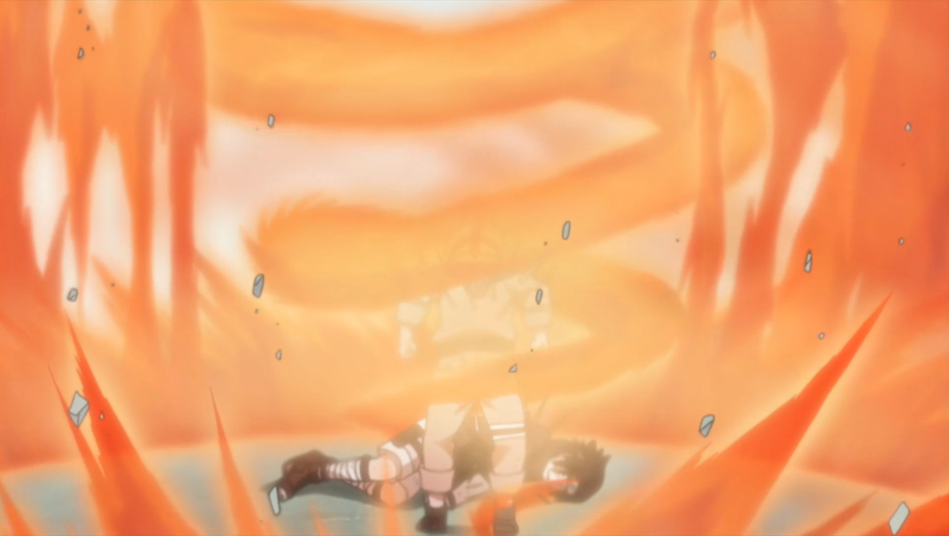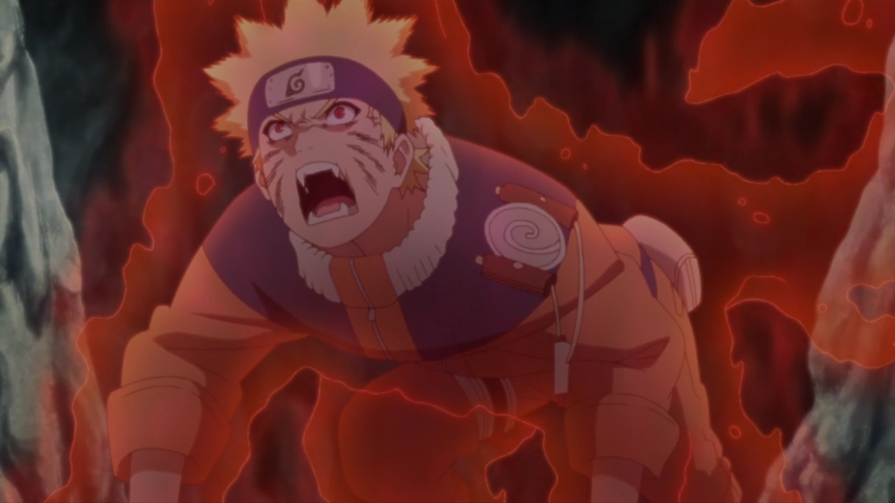 Naruto transforming from his Nine-Tails Chakra Mode into his Kurama Mode.