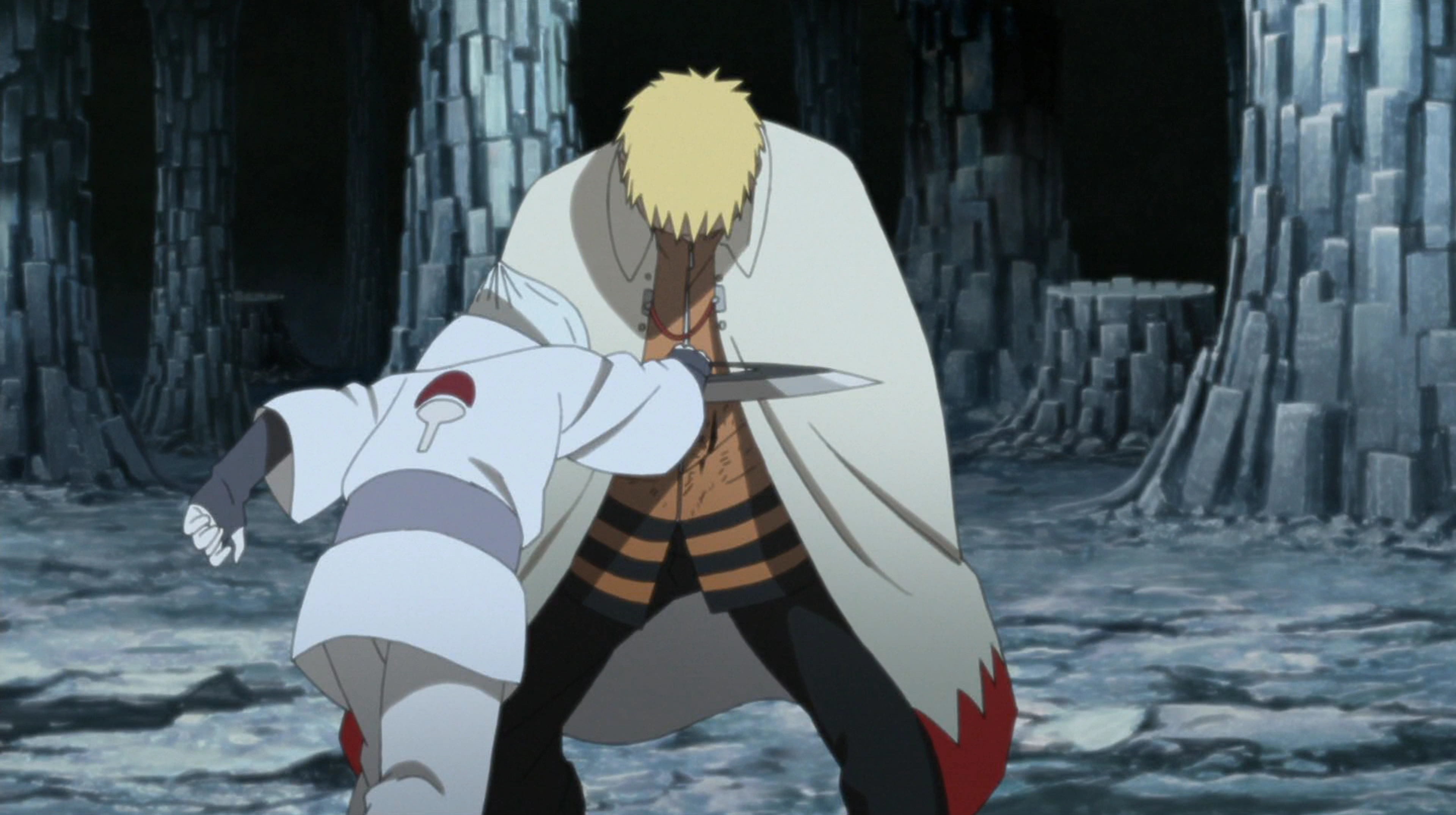 As an adult, Naruto becomes wiser and more mature, though he retains some of his negligence for honourifics.[44] Although he finally achieves his dream of becoming Hokage, its many tasks not only overwhelm Naruto at times, but often leave him unable to spend time with his family, particularly upsetting his son Boruto. He admits that part of this stems from not having grown up with a father himself, making it difficult for him to know how to interact properly with his own children, mostly with his son.[45] Naruto is also more responsible in his duties as Hokage and as a father; he forbids use of the Kote in the Chūnin Exams as it diminishes a shinobi's true potential; he is disappointed by Boruto's cheating in the exams and even removes his forehead protector in front of the audience after lecturing him. Nevertheless, Naruto deeply loves his family, as he creates shadow clones to tend to them while he's busy, protects them in times of danger, spends time with them when he can, and expresses pride in his children's successes.[39] He in fact adopts Hiruzen's philosophy that everyone in the village is his family, believing that true relationships are made up of love rather than blood relations.[46] His refusal to give his son any special treatment due to their blood-relationships, along with the insistence that the boy professionally addresses him as "Seventh" or "Hokage" while in the office, is a testament of Naruto's lack of bias and prejudice.[39] However, after facing Momoshiki Ōtsutsuki and realising how his overly-committed nature serving the entire village was greatly affecting his own family's happiness, Naruto came to accept that he needed to give them more attention. As such, by accepting more help from others, Naruto became able to enjoy more time with his family, restoring the same healthy relationship he had with them before he became Hokage.