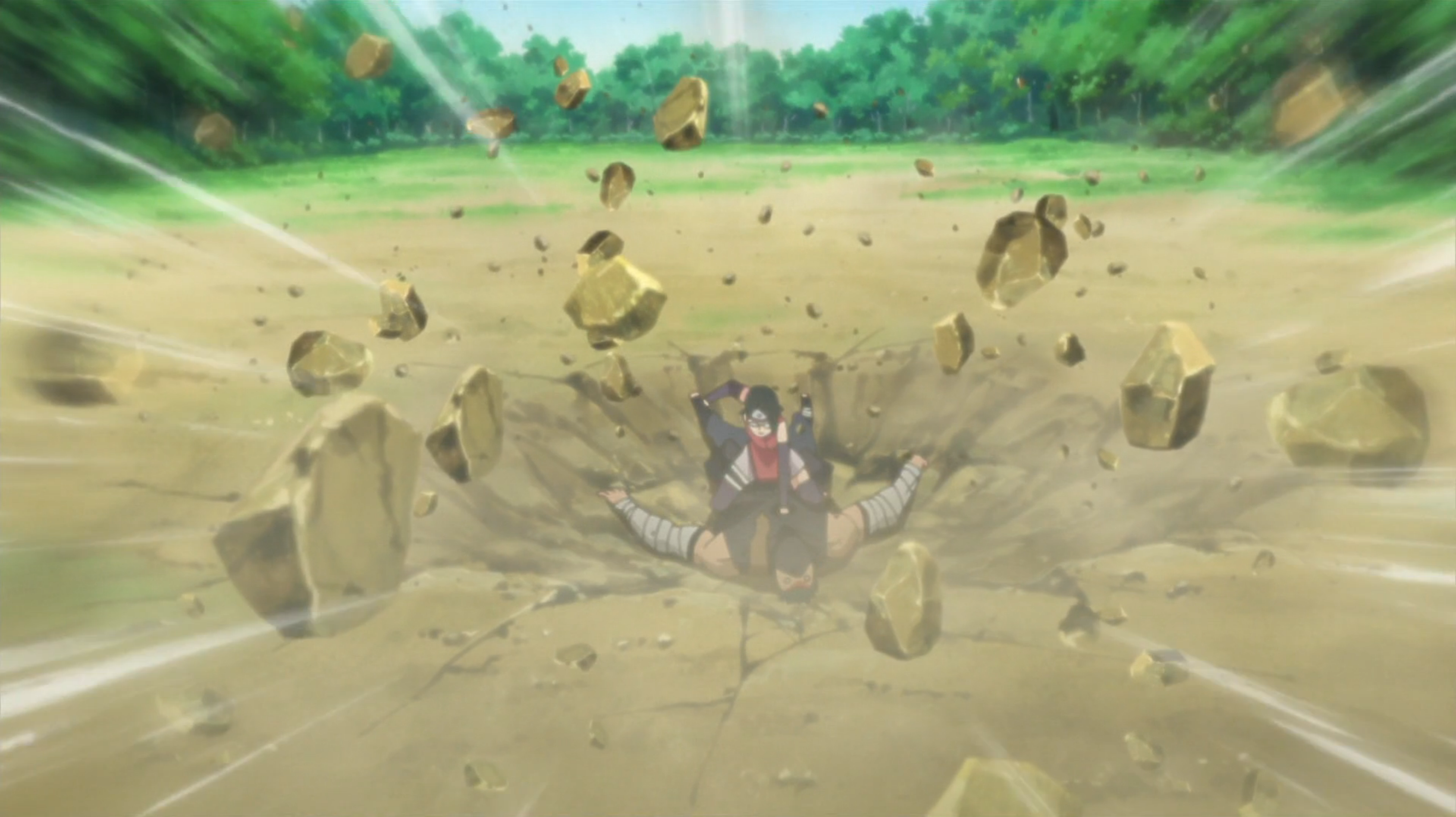 As an Uchiha, Sarada has powerful chakra.[26] She also inherited her mother’s elite chakra control and ability to use it for superhuman strength.[27] Even before graduating from the Academy, this enhanced strength could allow her to lift and hurl massive structures with ease or release the collected chakra on her strikes after making contact with a target for devastating effect, such as cratering the ground.[28] Though in the anime, this skill was initially underdeveloped, wasting too much chakra and making the end results much weaker. As such, Sakura trained Sarada to better refine it.[29] Eventually, her chakra-enhanced punches became strong enough to slightly crack Deepa's carbon defense,[30] which was previously shown completely withstanding attacks from Mitsuki’s Sage Mode[31] and Shinki’s Iron Sand.[32] She is also shown to be very adept in taijutsu, able to maneuver, with great efficiency and strike from various angles.[33][34] She is also incredibly fast, attacking the Kara Inner, Boro with her Chidori strike before he could react in time to avoid it.[35] Three years later, her physical prowess increased to where she could physically overpower the sentient God Tree, Hidari,[36] and could even dodge his Chidori-sneak attack at point blank range, then immediately counter with her own Chidori strike.[37]