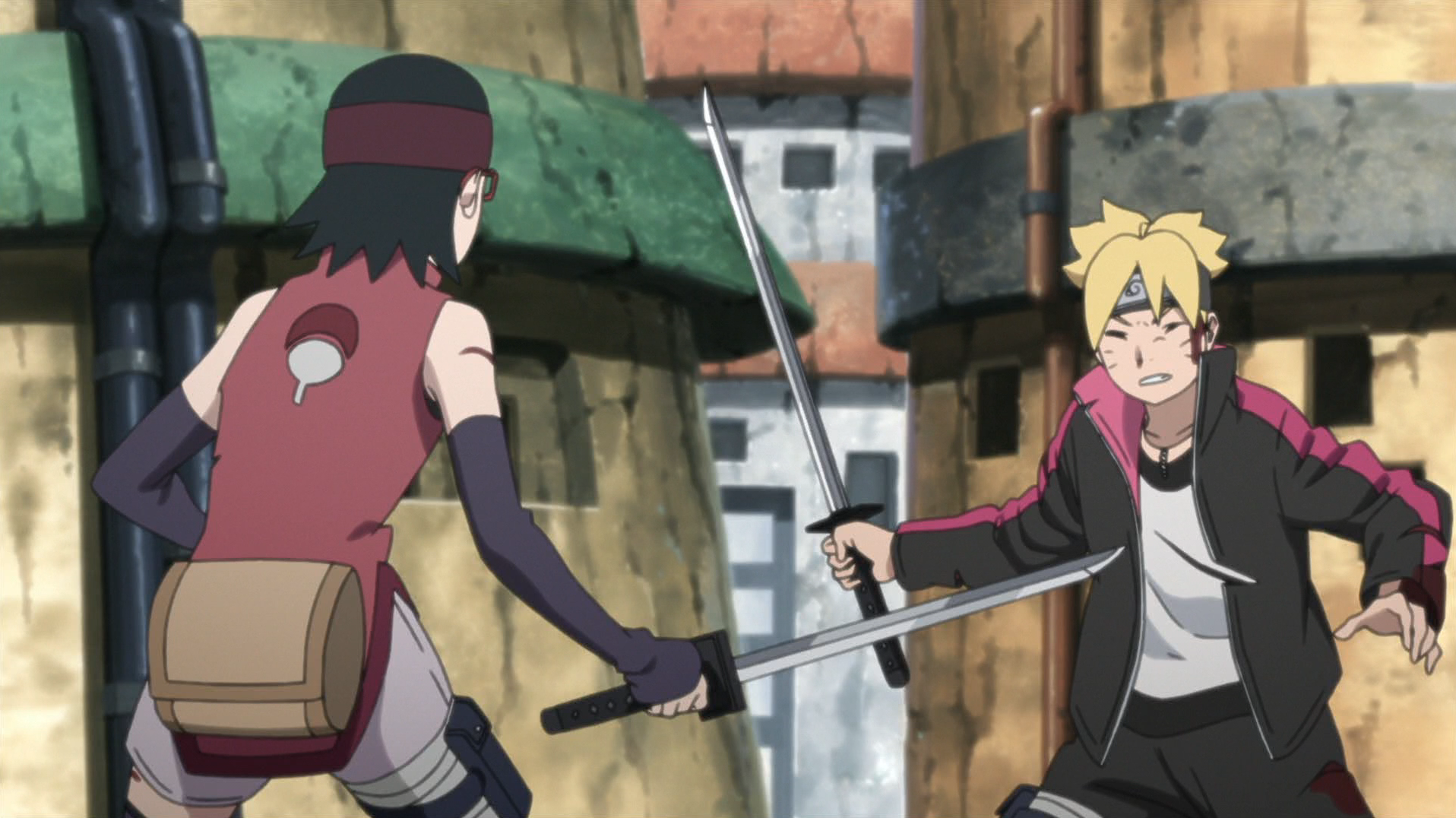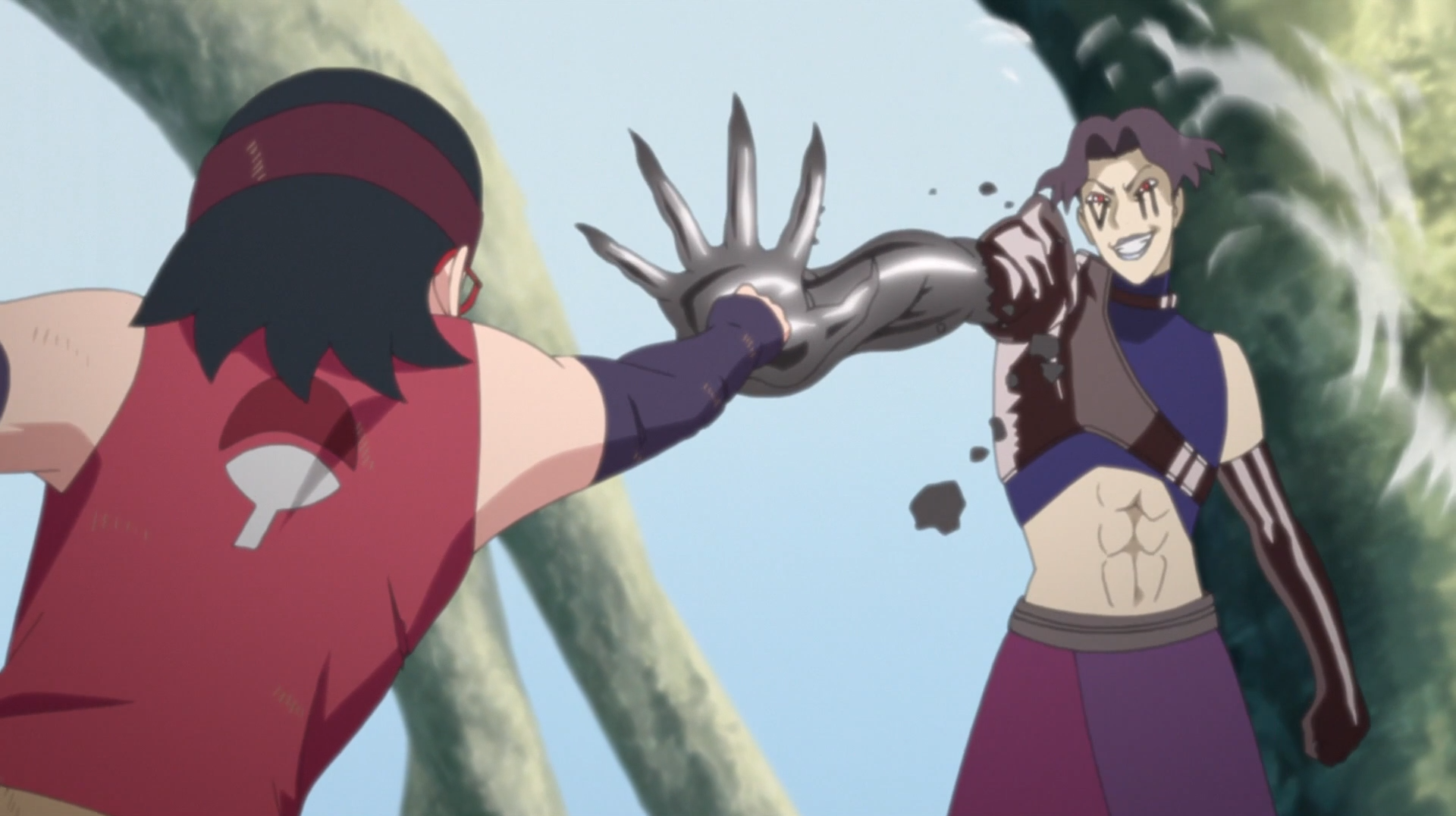 When Mitsuki joined her class, many girls found him very handsome, though Sarada sighed in distaste at them for judging someone purely on looks. The next day, Sarada participated in the classes welcoming party for Mitsuki, which became a disaster after Mitsuki disrupted the party with his Wind Release. Afterwards, a school repairman who was possessed went berserk, leading to Chōchō dragging Sarada into the fray. Combating the worker alongside, Iwabee, Shikadai Nara, Boruto and Mitsuki, the students managed to subdue him. The day after Sumire turned down Magire Kakuremino, Sarada and Chōchō protected her when he continued to stalk her, leading to him trapping the pair in a room while he abducted Sumire. After escaping, the group of students tracked Sumire to the Academy roof, during which Sarada blocked Magire's kunai attack on Chōchō. Talking to Magire, Chōchō deescalated the situation which consequently freed Magire from being possessed.
