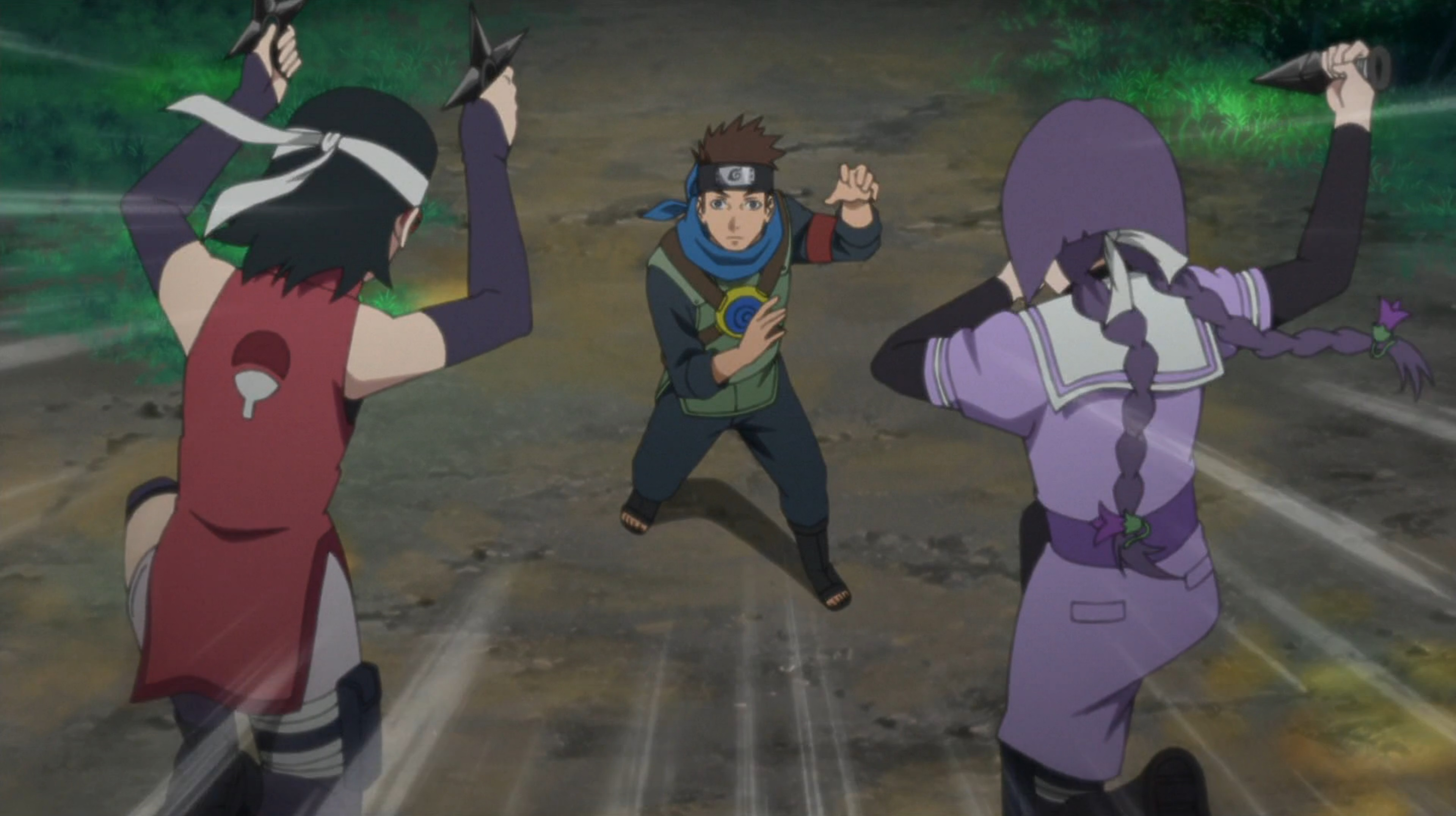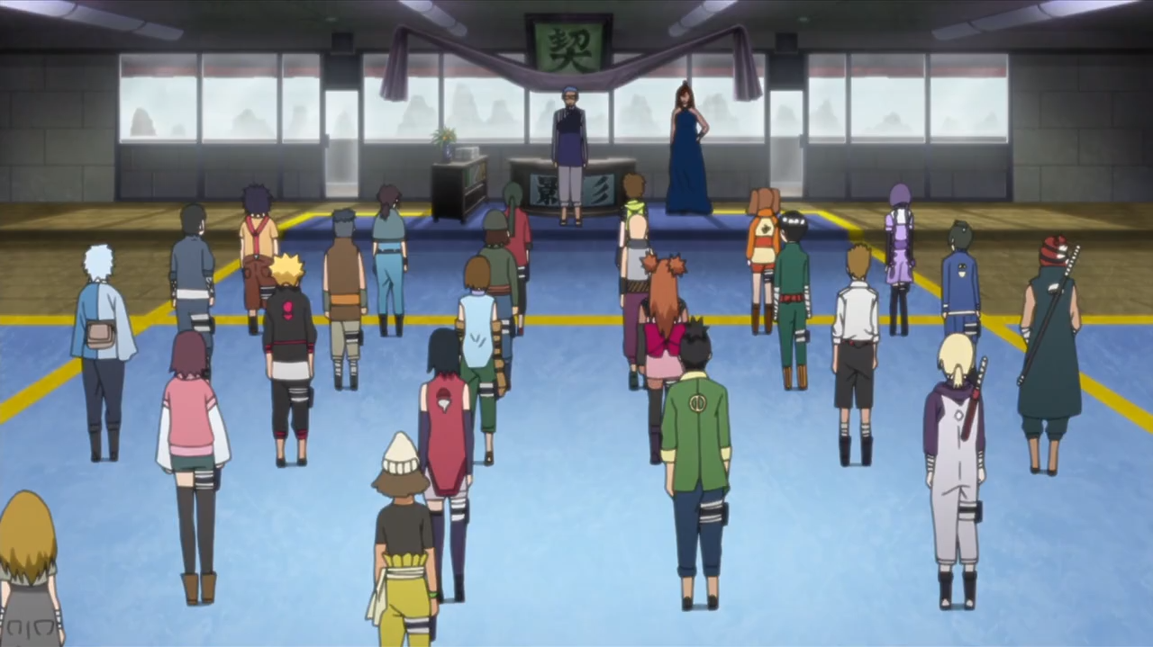 When the class began learning about the Summoning Technique, tension arose between Sarada and Boruto, which lead to the class' two genders bickering each other. Seeing this, Shino organised a race between the boys and girls, which involved reaching a flag onto of the Academy. The challenge quickly got heated, with many of the boys being taken out of the contest until only Boruto, Shikadai, and Inojin were left on their team. Getting desperate, Boruto found a summoning scroll and miraculously summoned a snake-like creature. Going on a rampage, it knocked Chōchō off the roof, leading to Sarada and Boruto rescuing her until Konohamaru Sarutobi arrived and subdued the beast. During the ordeal, Sumire Kakei captured the flag, though the girls chose to make peace with the boys.