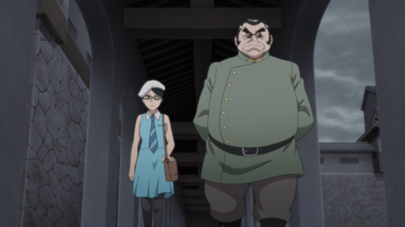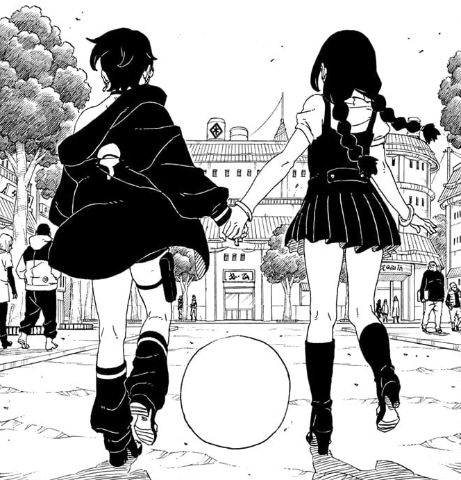 As her Academy graduation neared, Sarada became jealous that her classmates had the opportunity to train with their fathers, leading to her asking Sakura about Sasuke. Unable to answer if he wore glasses, Sakura accidentally destroyed their house when Sarada questioned if they were even married, resulting in her fainting. Leaving Sakura in Shizune's care, Sarada discovered a group photo of Taka, leading to her becoming suspicious of the woman with glasses photographed next to Sasuke. Unable to get details revolving around her birth from Shizune, she approached Chōchō, who had doubts about her own parents as well. Sarada decided to seek out Sasuke, leading to her heading to the Hokage Office, during which she overheard Naruto discussing plans to go and meet with Sasuke. Preparing to follow him, Chōchō tagged along, and they noticed Boruto arriving late to deliver a lunch to his father. Sarada offered to take it in his place, in order for her to have a reason to chase after Naruto.