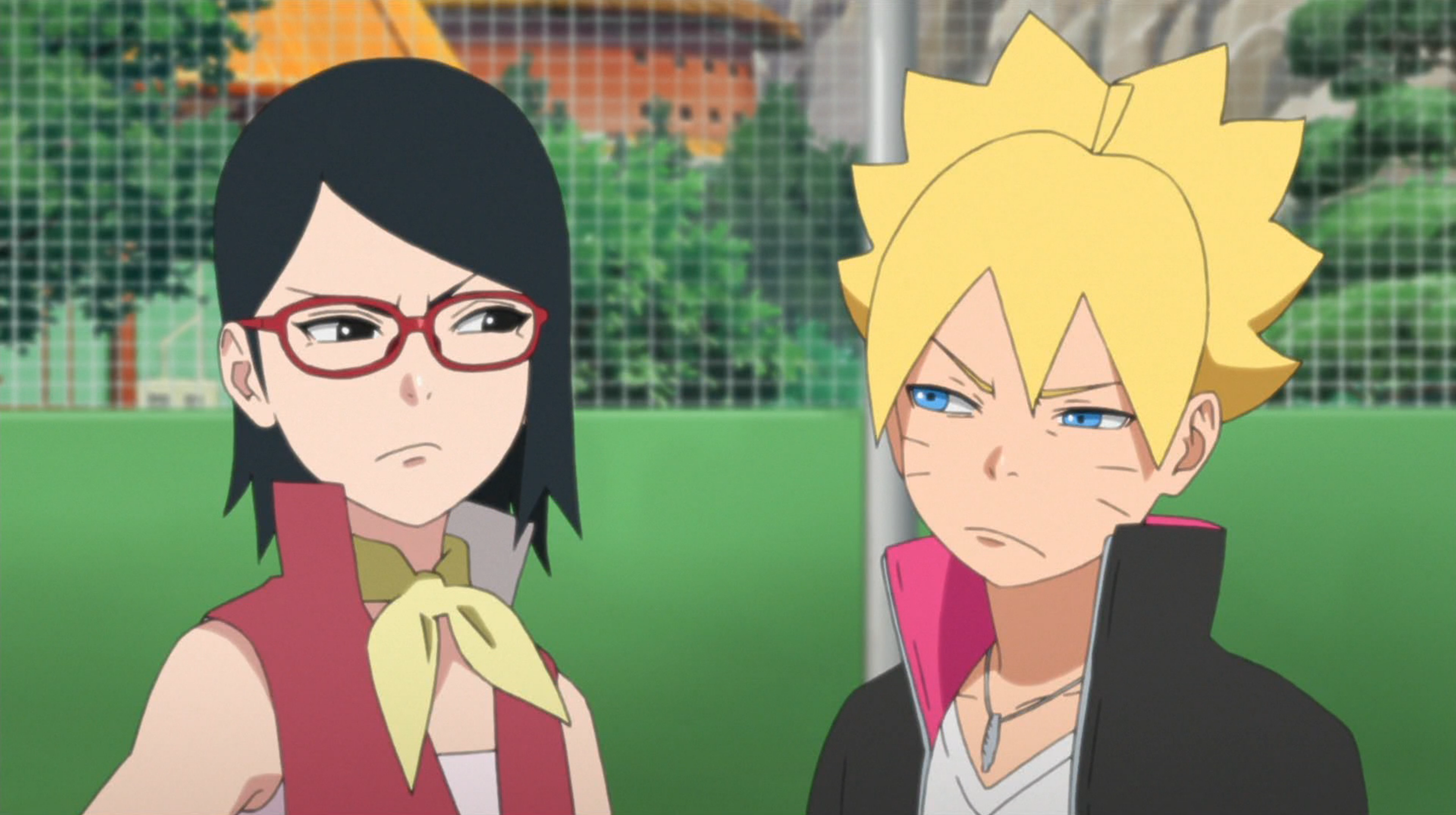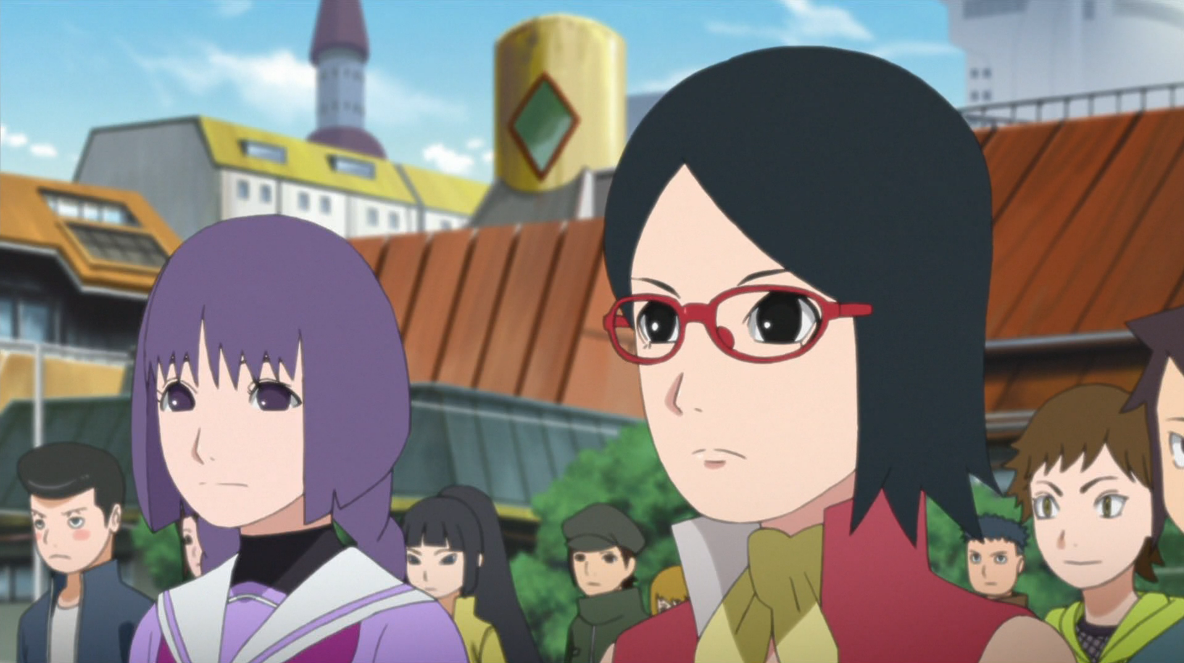 In the anime, on the first day of the Academy, Sarada attended her class entrance ceremony, and was placed in Shino Aburame's homeroom. After Boruto's suspension ended two weeks later, Chōchō noted that Sarada was especially close to Boruto due to their respective parents, though Sarada voiced her dislike of being considered close friends simply because of their parents. Later as Boruto fought against Iwabee Yuino, she watched the fight in the Training Hall, leading to Anko Mitarashi scolding them for skipping class.