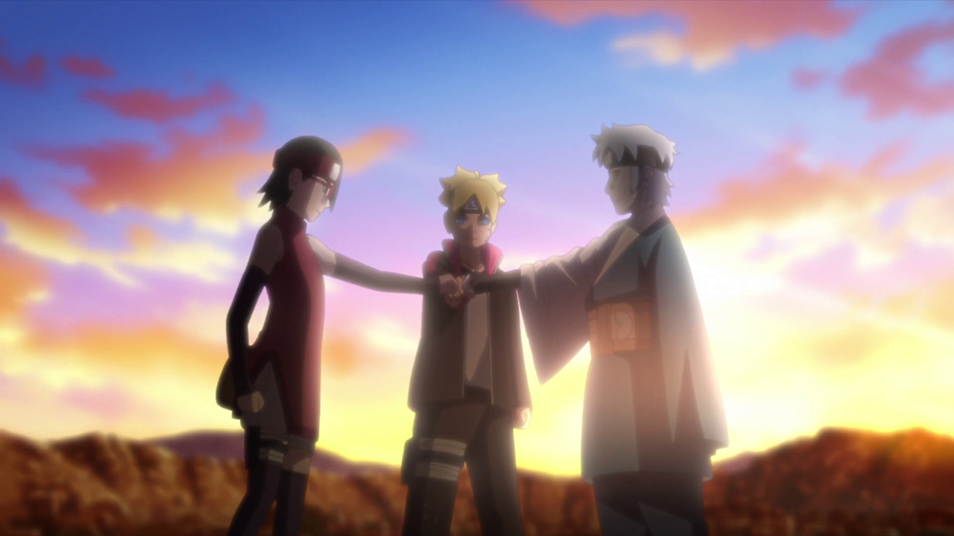 Arriving at Shin's hideout, Sasuke immediately rescued Sakura while crippling Shin, leading to his clone sons finishing him off. While Naruto and Sasuke fought the clones, Sarada attacked the creature that the original Shin was in the process of using to escape before he died. Approached by more clones, Sarada launched herself into the battle and decimated their foothold, repelling them away. After Naruto deescalated the situation and calmed the clones, Sakura told Sarada there was no doubt they were mother and daughter, to which Sarada agreed, and Sasuke stated she is the proof of her parents' connection. After the ordeal, the group enrolled the clones into the Konoha Orphanage before returning to Konoha with Sasuke. After spending some time together, the Uchiha took a family photo, and Sarada along with Sakura later saw Sasuke off as he left the village. In Orochimaru's hideout, Karin revealed that the umbilical cord belonged to Sakura and Sarada. Returning to the Academy, Sarada thanked Boruto, as her act of delivering Naruto's launch to him ultimately led her to decide on becoming Hokage. In the anime, after Sarada learned Boruto's Shadow Clone Technique by copying it with her Sharingan, she began to train her dōjutsu in secret, hoping to master it before revealing it to her peers.