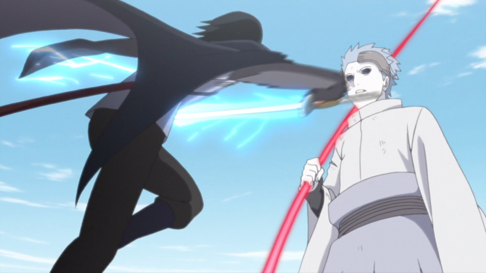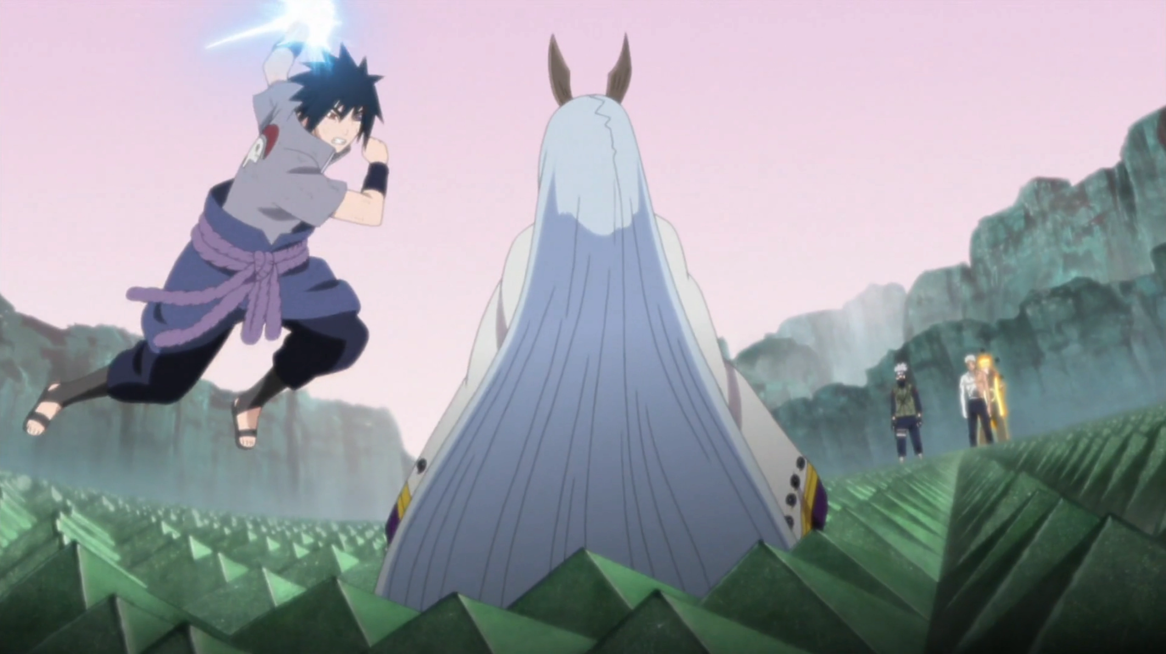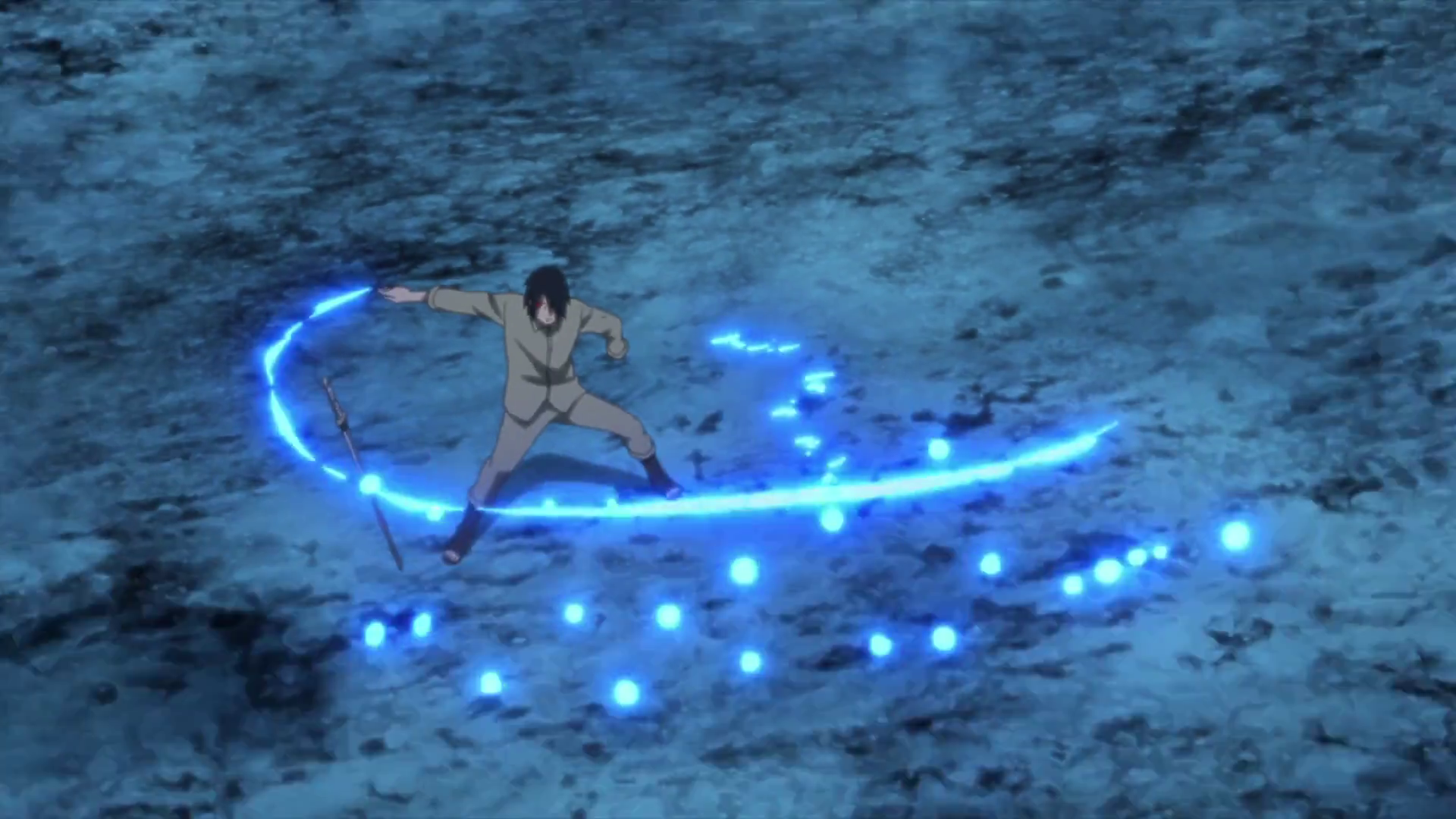 Sasuke is also a formidable user of Lightning Release, making first use of it with the Chidori taught to him by Kakashi. While effective at piercing most targets, the standard Chidori is a very close-range attack. For this reason, Sasuke uses the principles of Chidori to create several long-range jutsu in Part II, such as throwable needles, extendable swords, and scattershot streams. He often channels his lightning chakra into his Sword of Kusanagi to increase its cutting power.[45] When using his cursed seal or the Six Paths Chakra, his lightning chakra becomes darker in colour, though it's not clear if this changes its actual properties in any way. By adulthood, Sasuke is capable of using his Lightning Release to further augment his speed during the battle, to the point it matches Kinshiki's speed.[16]