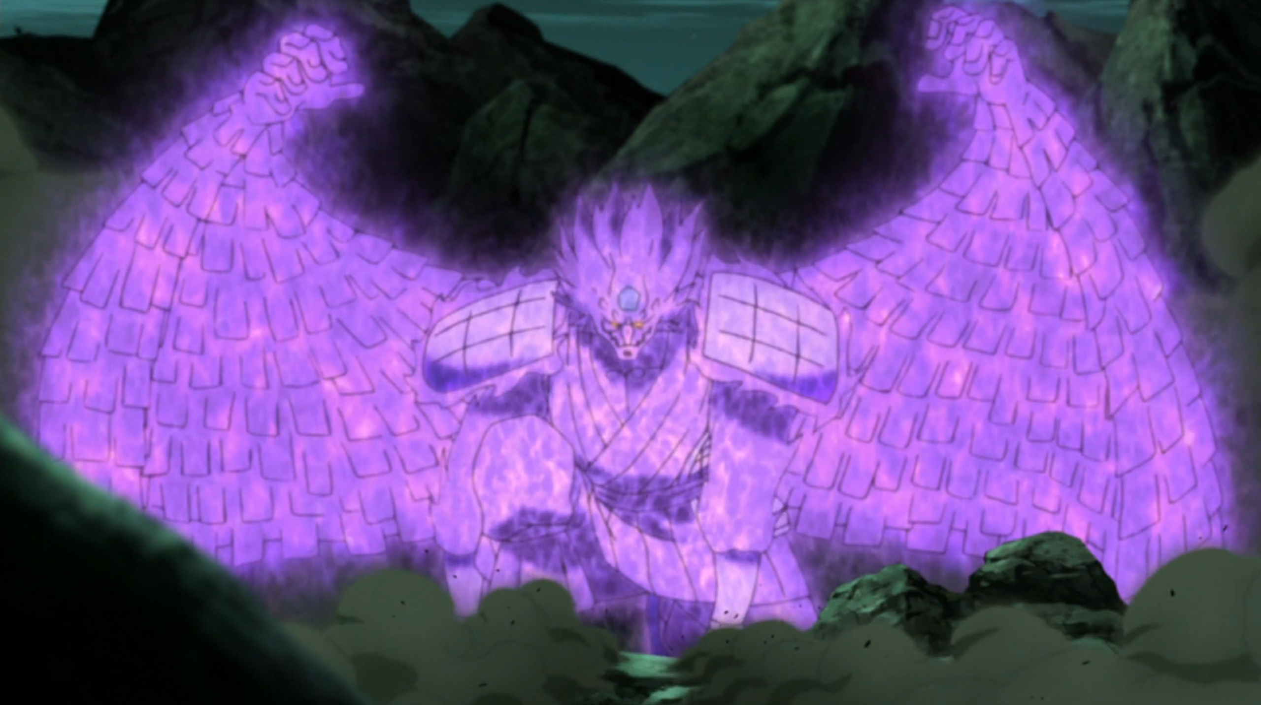 Like all Susanoo, Sasuke's has several swords at its disposal that it can use against larger targets or to easily destroy nearby structures. More commonly, his Susanoo employs a bow that can fire arrows at rapid speeds and that can, when needed, double as a shield. Though most of these arrows are made of the same chakra as Susanoo itself, Sasuke can also fashion arrows made from Amaterasu's flames or,[51] by channelling the tailed beasts' chakra, lightning; Sasuke calls the latter Indra's Arrow, his strongest attack.[52] Susanoo can also be formed around the Nine-Tails in order to give it a sword and armour of its own,[53] and serve as a medium for his various techniques like Chidori.[54]