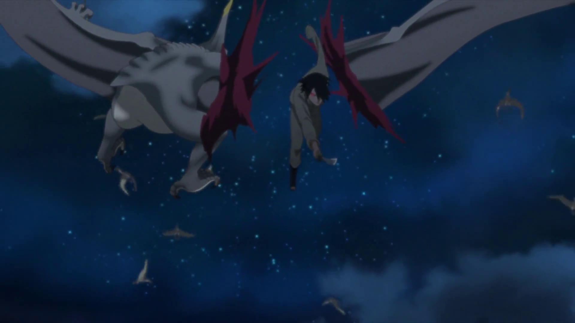 Sasuke learns to summon snakes during his time with Orochimaru. He typically summons them as shields, rapid ground transportation, or to bind targets. Unseen outside of the Animal Path, Sasuke can also summon a second animal species: hawks. His use of hawks is more limited than snakes, using them only for flight and the additional manoeuvrability that allows. By adulthood, Sasuke can use the Shadow Clone Technique, able to easily produce eight clones at once.