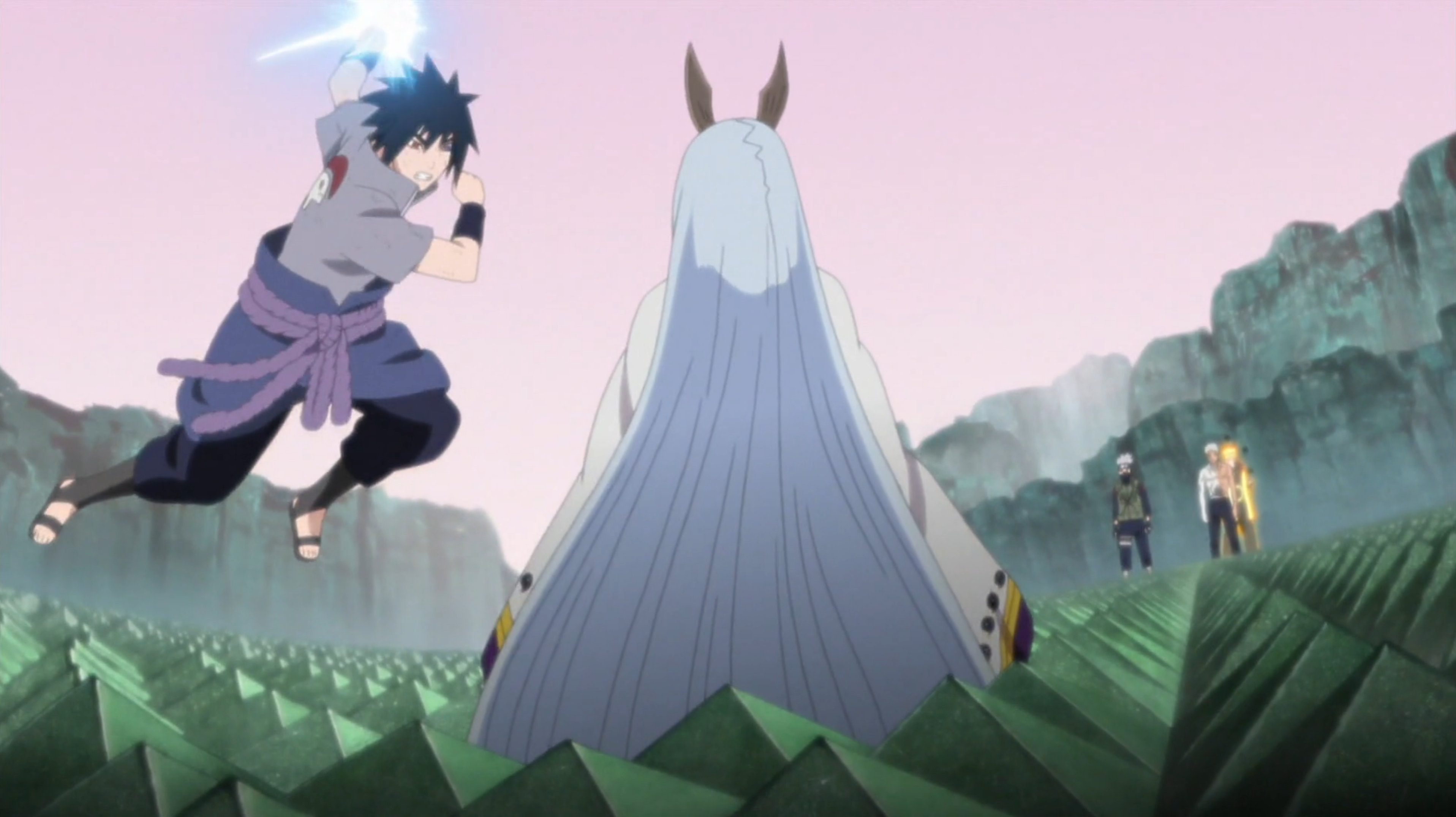Sasuke's chakra is quite strong, in part due to being the reincarnation of Indra Ōtsutsuki. Whenever Sasuke's Curse of Hatred deepens, others remark how much stronger,[26] darker,[27] and more sinister his chakra becomes.[28] His reserves are also quite large, enough to use Chidori twice a day during Part I without aid. By Part II, Sasuke is able to use Chidori and related techniques multiple times in a single day, as well as summon creatures as large as Manda. His chakra control, though less refined than Sakura Haruno's, is nevertheless very high. In the anime, he could effectively perform hand seals between his own and an enemy's hand.[29] In adulthood, after losing one of his arms, he learned to use one-handed hand seals.[30] His chakra's strength was also potent enough that Urashiki Ōtsutsuki openly commented on the strength of the chakra he stole from Sasuke, noting it was magnificent. While not an actual sensor himself, during his final battle against Naruto, he sensed Naruto's build-up of chakra and natural energy from Kurama.[31] Also, in sharing half of Hagoromo's power with Naruto, he is also able to sense Naruto's chakra from a different dimension.[16]