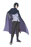 Sasuke loses his left arm at the end of the Fourth Shinobi World War, though unlike Naruto, he opts not to have it replaced with a prosthetic that was being prepared for him. In The Last: Naruto the Movie, he wears a black high-collared shirt, a midriff-exposing flak jacket, and light blue pants. Most of this goes unseen, as he wears a tattered light brown poncho over it. He wraps bandages around his ankles and a blue sash around his head during this appearance. In Sasuke Shinden: Book of Sunrise, he wears a black cloak over a black shirt and pants with a white belt and white bandages wrapped up to his knees on both legs. In his later adulthood, Sasuke dons a black cloak with purple lining, and a grey, long-sleeved, collared shirt, over which he wears a periwinkle vest. He also wears black pants, a purple belt, and dark grey fingerless glove on his remaining hand. He once again wears his forehead protector, letting it hang from his left hip.[21]
