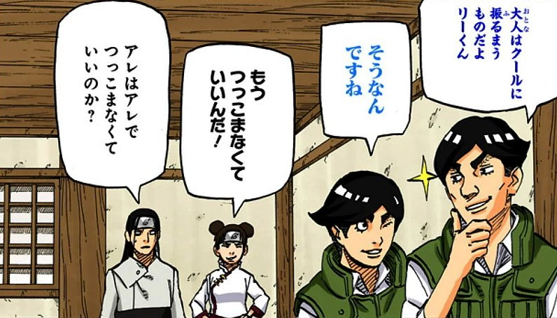 - (To Naruto) "Three members of Team Guy specialise in close-contact battles so I often render aid from the distance. I don't mind providing back up, but I was hoping to find new ninja tools that would enable me to fight on the front lines."[16]