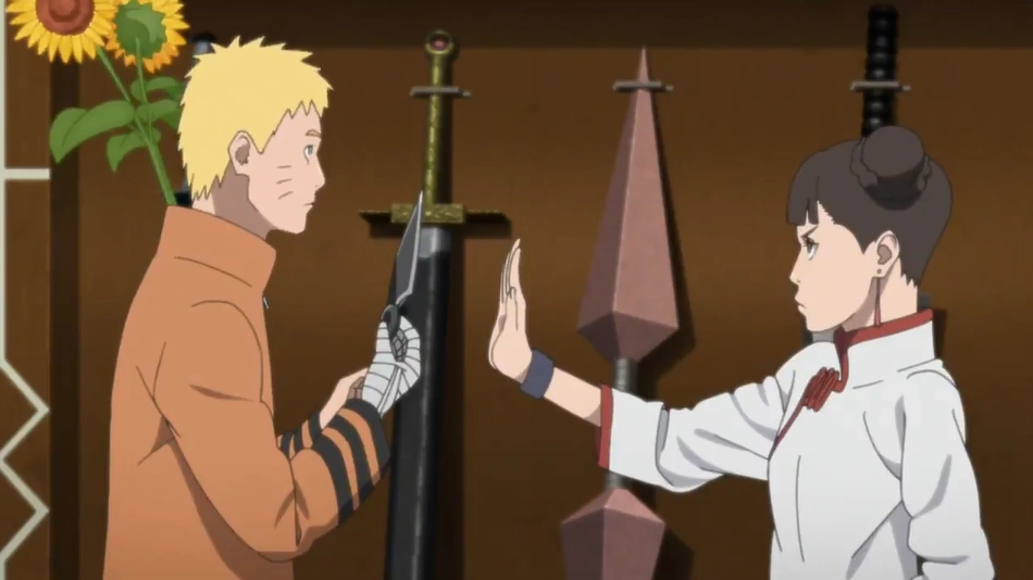 Main article: Time Slip Arc In the anime, when Urashiki Ōtsutsuki was spotted in the area, Tenten joined several other Konoha-nin in pursuing him. However, this turned out to be a diversion by the alien, who placed a genjutsu on them to let him sneak into the village. Meanwhile, the grown-up Sasuke and Boruto were sent back in time to shortly after Sasuke's defection. There, the two pretended to be travelling performers and were put under watch by Naruto. During which, past-Tenten and her friends helped Boruto and Naruto clean up a bathhouse after the commotion Naruto and Jiraiya caused.