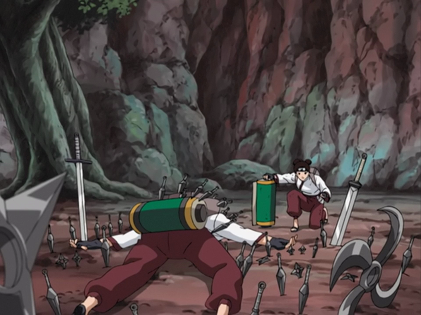 In the anime, she can use her two small scrolls to perform the Twin Rising Dragons to launch a variety of weapons in rapid succession;[18] which she was limited to physically having to touch in order to execute until Part II. She equips a large scroll in Part II, which she can launch above her opponent to rain a multitude of weapons down onto them.