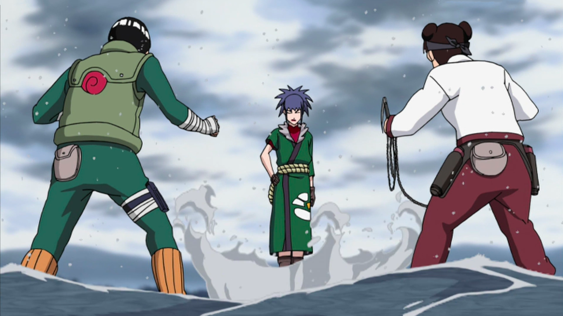 She and her teammates join back up with Team 8 and Team 10 and take over fighting the chimera for and exhausted Shikamaru, Sakura, and Sai. In the end when Hiruko revealed his true form to Naruto and Kakashi, she and the others all defeated his chimera together with Tenten landing the final blow with Twin Rising Dragons, covering the beast in exploding kunai and detonating them. She and the others praise Naruto for defeating Hiruko and witness the strange moment between Naruto and Kakashi that occurred because of his creepy smile after remembering Obito.